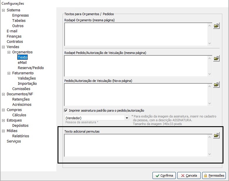 Imprimir - Incluida opção para incluir textos conforme o item na reserva, neste caso criado um campo nas configurações para informar um texto a ser adcionado na impressão da prévia/autorização caso a mesma possua itens de permuta, assim o texto é incluido automaticamente.