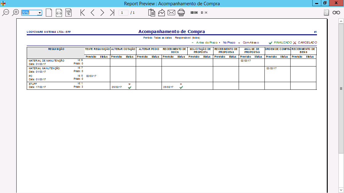 Neste relatório você poderá obter informações sobre o acompanhamento de cada etapa de uma compra. Se desejar saber de um determinado período ou responsável, especifique nos filtros de seleção na tela exibida.