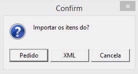 Nessa tela você deverá confirmar se a importação dos produtos será feito somente pelo pedido ou também por XML, é que mesmo que você já tenha optado por importar os produtos pelo pedido (clicando no ícone do binóculo), o sistema ainda lhe possibilita realizar a leitura do XML também, pois assim o XML ficará vinculado ao pedido. Essa opção foi criada para evitar situações em que o pedido já havia sido criado no sistema mas o operador optou por importar os produtos apenas por XML (clicando na opção "importar NFe", que veremos após), deixando assim o pedido como "pendente". Dessa forma, selecionando o pedido desejado e após confirmar a importação também por XML, o pedido e o XML ficarão vinculados e o pedido não ficará como pendente.
