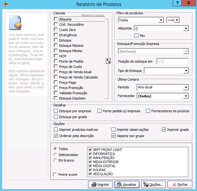 Com os Relatórios de Produtos você obtém uma relação de todos os seus Produtos com o respectivo preço de venda, quantidade em estoque, preço de promoção (se o produto estiver) com sua validade. Pode-se também aplicar alguns filtros para verificação mais específica do estoque das empresas. Tudo isso ainda pode ser realizado de um departamento/grupo específico de produtos.