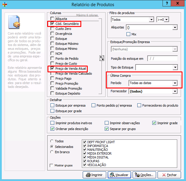 3° Em Colunas selecione os filtros: Cód. Secundário, Preço de Venda Atual;