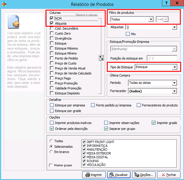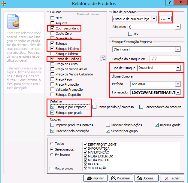 3° Em Colunas selecione os filtros: Cód. Secundário, Estoque, Estoque Máximo, Ponto de Pedido;