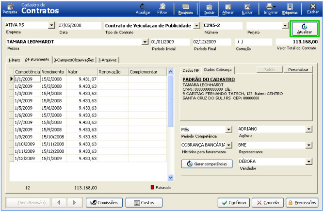 Note que neste caso já haviam se passado dois meses quando o contrato foi modificado assim sendo já haviam sido feitos duas faturas, mas não há problemas, ao clicar em Atualizar faturamento somente entre as parcelas não faturadas que haverá a redistribuição do valor. Você irá notar que na guia de Itens também já aparecerá o que foi modificado: